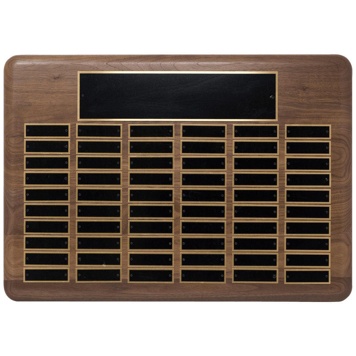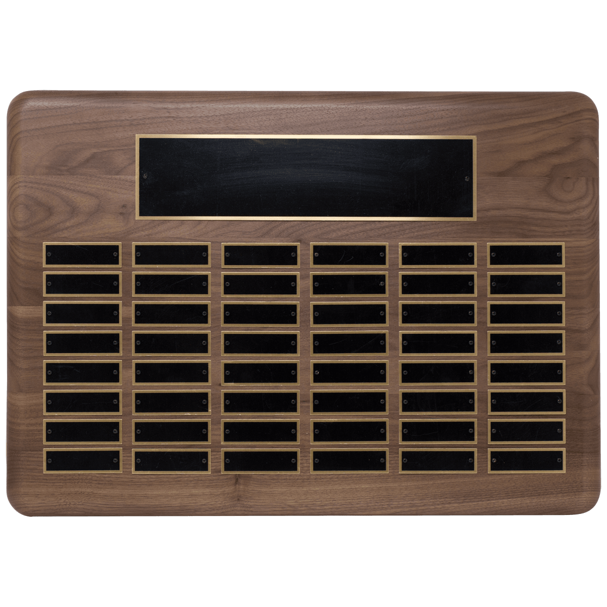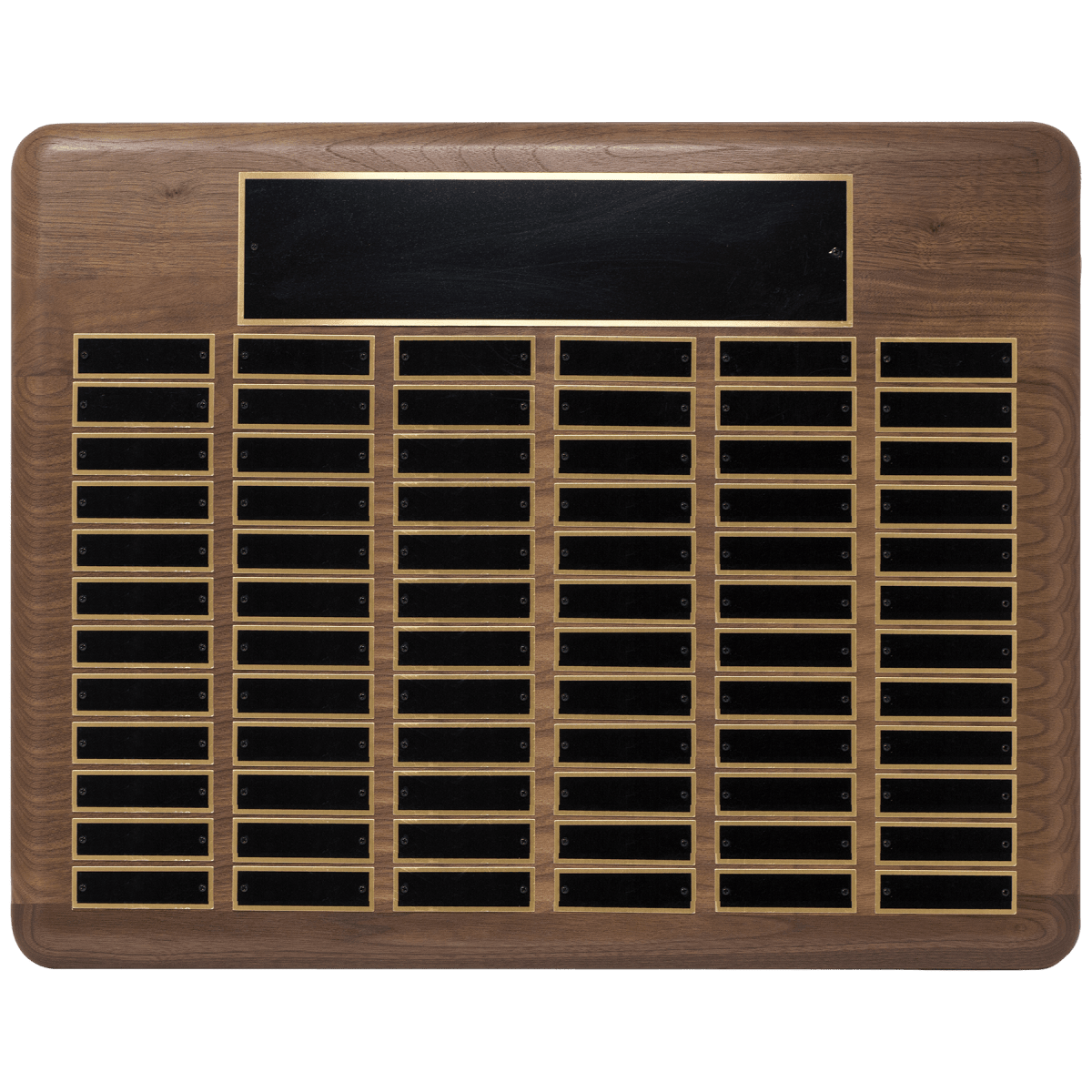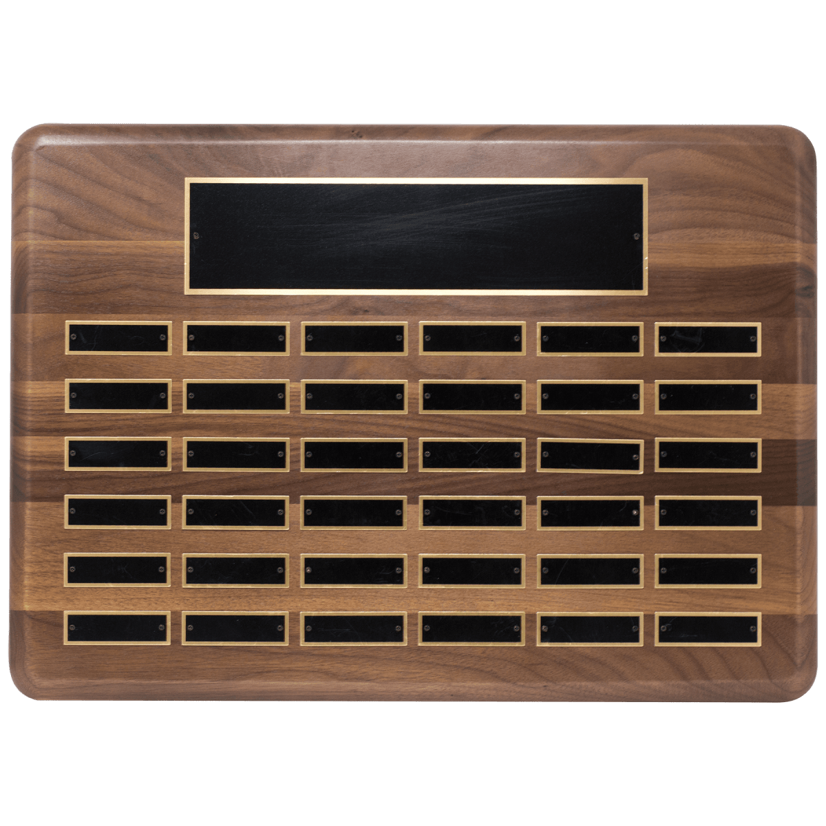 Solid American walnut perpetual plaque with 11 plate combinations. Made in the USA