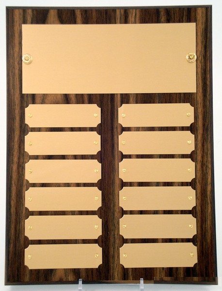 This 9 x 12 Perpetual Plaque includes 12 plates. A custom logo can be put on header plate for additional $10.00 if desired.