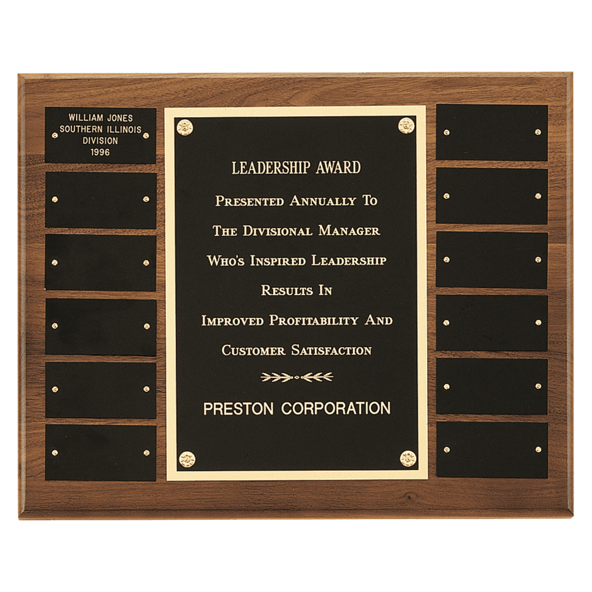 Solid American walnut perpetual plaque with 12 black brass plates.